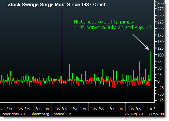 Aug. 25 (Bloomberg) — U.S. stock price swings are widening at the fastest rate since the 1987 crash as concern the economy is stalling and optimism the Federal Reserve will try to spur growth whipsaw investors.The CHART OF THE DAY shows a measure known as three-month historical volatility for the Standard & Poor’s 500 Index jumped 119 percent between July 22 and Aug. 23, the biggest rise over the same amount of time in almost 24 years, according to data compiled by Bloomberg. Excluding that year, the current increase is the biggest in at least four decades.